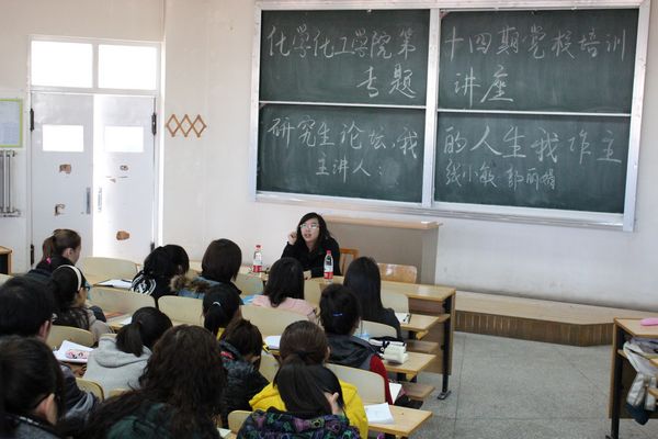 11月12日上午以“研究生论坛:我的人生我做主”为主题的讲座在北教321举行,化学化工学院第十四期业余党校培训200余名入党积极分子聆听了讲座,讲座由研究生党支部副书记张小敏和研究生党员胡丽娟主讲。