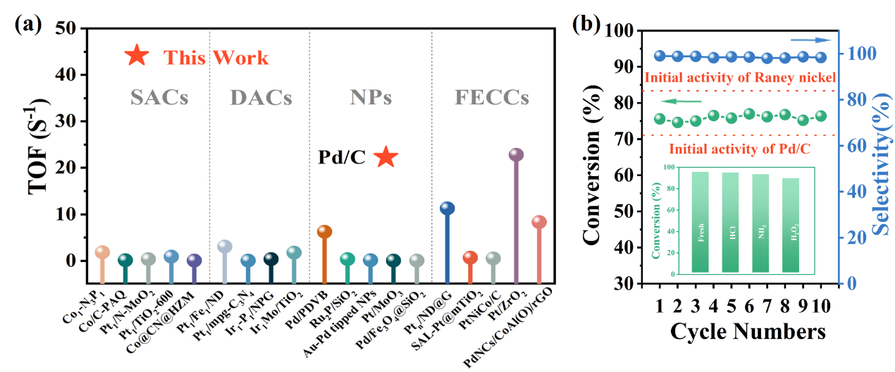 图1. (a) Pt1/Ni@C催化剂在不同处理后的循环使用性能与催化活性;(b)不同加氢催化剂TOF值的对比。