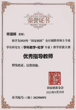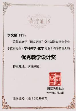 2025年9月26日至28日,全国“田家炳杯”全日制教育硕士专业学位研究生学科教学(化学)教学技能大赛决赛在哈尔滨师范大学举行。本次大赛汇聚了来自全国众多高校的优秀学子同台竞技。经过激烈角逐,我院学子表现优异,载誉而归。其中2024级学科教学(化学)专业硕士研究生孙一文荣获二等奖,李文星、李道燃荣获“优秀教学设计奖”,毕淑娴老师被评为“优秀指导教师”。