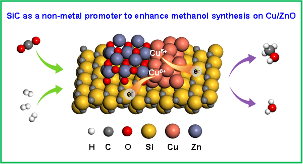 近日,在宁夏大学化学工程与技术教育部“双一流”学科建设经费支持下,化学化工学院(省部共建煤炭高效利用与绿色化工国家重点实验室)王周君教授团队在CO2加氢制甲醇方向取得新进展。团队创新性地引入碳化硅(SiC)作为非金属促进剂,成功开发出甲醇合成性能显著提升的Cu/ZnO/SiC新型催化剂,并揭示了SiC通过促进带正电铜物种(Cuδ⁺)的形成,进而调变界面结构、加速中间体转化,最终提升Cu/ZnO催化剂甲醇合成性能的催化机制,相关研究成果发表于化工领域顶级期刊《AIChE Journal》(Doi:10.1002/aic.70168)。该论文第一作者为谢贵明博士,通讯作者为王周君教授、白张君博士及北京化工大学崔超男副教授,宁夏大学为第一署名单位。