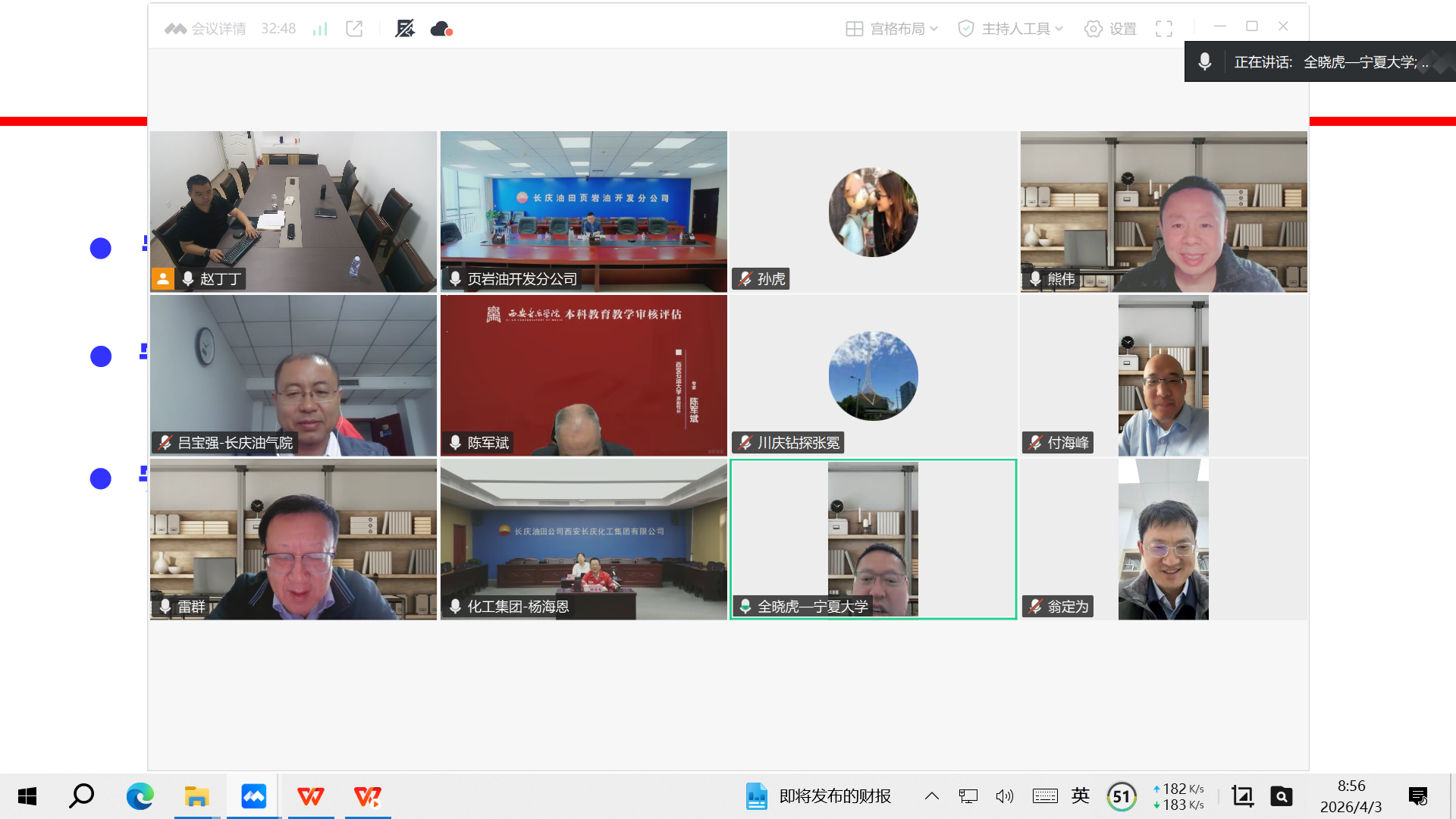 4月3日,西安石油大学原副校长陈军斌教授、中国石油集团川庆钻探工程有限公司党委委员、副总经理孙虎、一级专家张冕、中石油勘探开发研究院压裂中心主任翁定为教授、非常规油气研究所所长熊伟教授、高级工程师付海峰、西安长庆化工集团有限公司董事长、书记杨海恩、高级工程师程芳、长庆油田页岩油开发分公司执行董事、书记马立军、长庆油田油气工艺研究院油田化学与防腐所所长李楷、高级工程师吕宝强、宁夏大学国家大学科技园总经理全晓虎、油气资源研究中心雷群教授及团队成员等参加了线上专家咨询会。