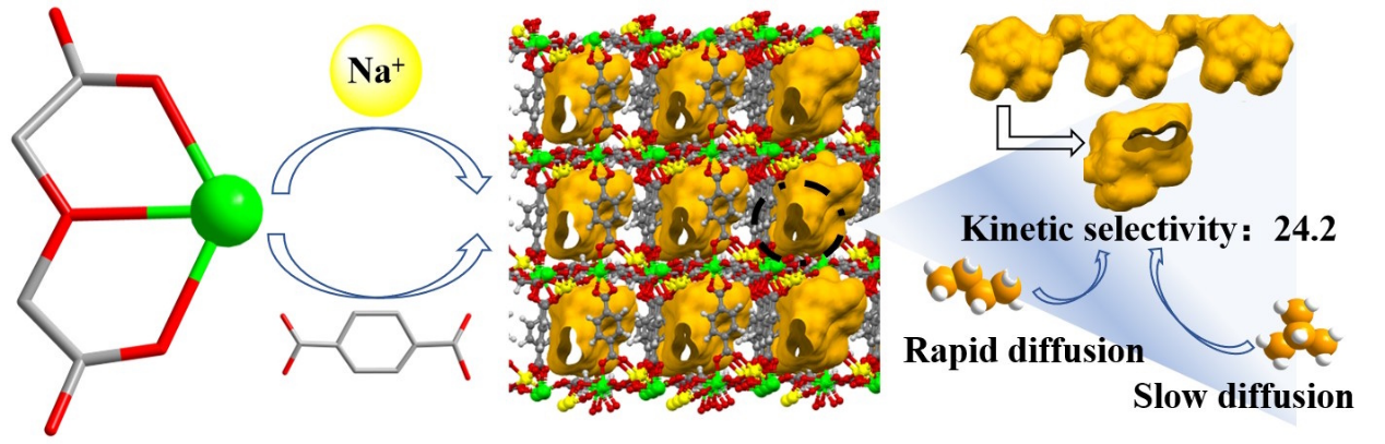 该研究基于镧系金属配体策略,通过引入碱金属离子Na+作为结构导向剂,成功构筑了一例具有沙漏型一维孔道的Tb-Na异金属“柱-层”MOF材料(NXU-2-Tb)。其周期性窄孔道(约4.33 × 5.74 Å)能够有效限制支链异丁烷的扩散,同时促进直链正丁烷的快速通过。动力学吸附实验表明,该材料对正/异丁烷的动力学选择性达24.2。动态穿透实验进一步证实,NXU-2-Tb可在宽流速(1~10 mLmin-1)和宽温度(298~333 K)范围内稳定分离正/异丁烷混合物,并能直接获得高纯度异丁烷(>99.99%),且循环稳定性优异。该工作通过精准的孔道几何工程,实现了对低碳烷烃气态同分异构体的高效动力学筛分,为此类物质的高效节能分离提供了新策略。